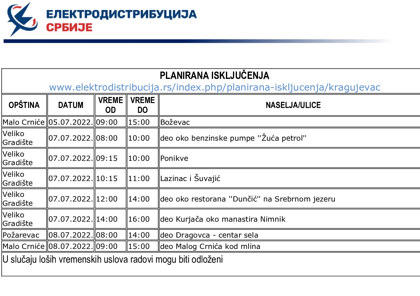У периоду од 5. до 8. јула, најављени су нестанци струје у деловима Малог Црнића, Великог Градишта и Пожаревца.