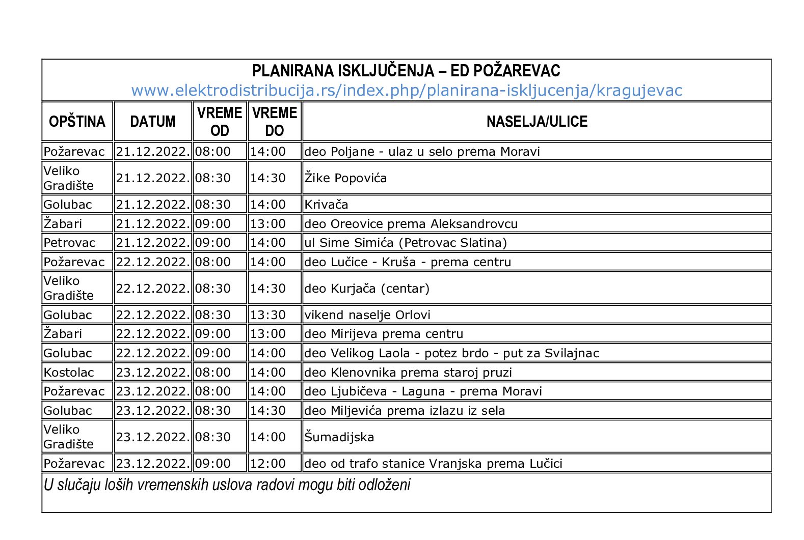 Ове среде, 21. децембра, без струје ће бити делови Пожаревца, Костолца, Великог Градишта, Голупца, Жабара и Петровца на Млави.