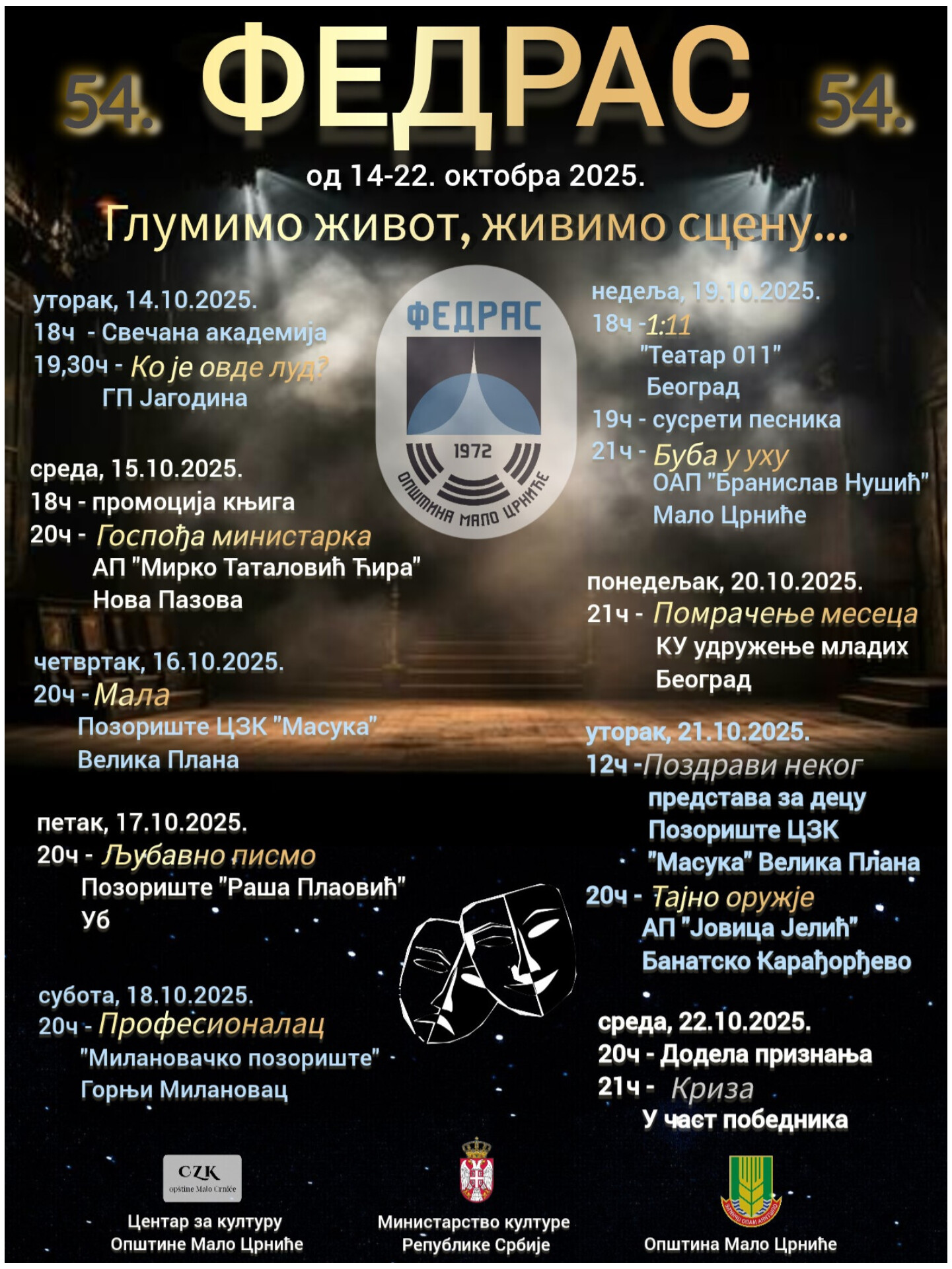 У уторак, 14. октобра, почиње 54. ФЕДРАС, на Дан Општине Мало Црниће. Фестивал драмских аматера Србије трајаће до 22. октобра.