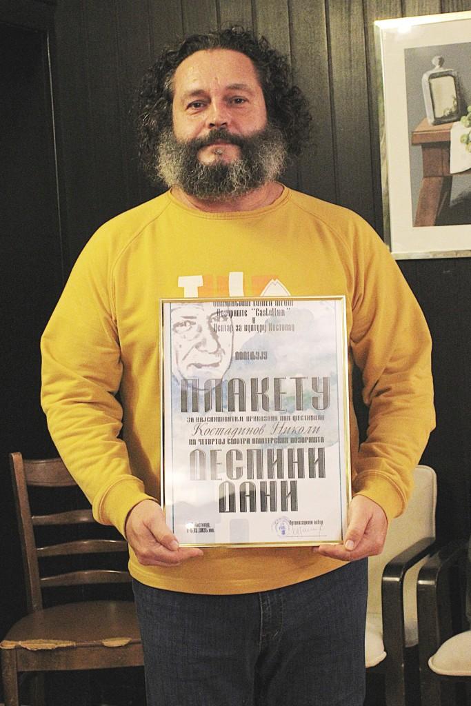 Чланови жирија били су једногласни у одлуци да за насликовитије приказан лик Фестивала награде Николу Костадинова који је у представи „Професионалац“ у извођењу пожаревачког позоришта одглумио пензионисаног полицајца Луку Лабана.