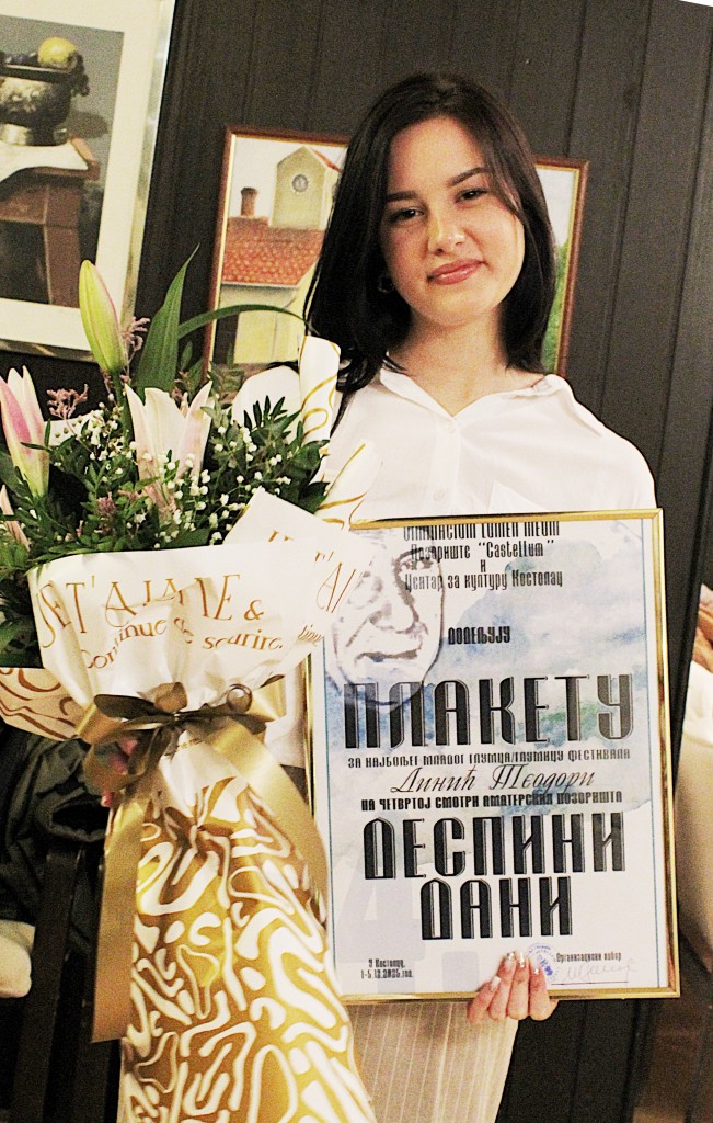 У категорији најбољи млади глумац/глумица „Деспиних дана“ награђена је Теодора Динић за лик Милице у комаду „Женски оркестар“.
