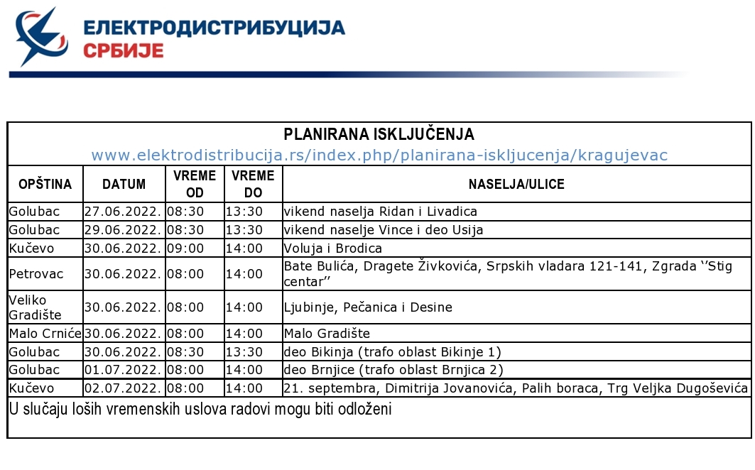 Због радова на територији Браничевког округа, од 27. јуна до 2. јула, из Електродистрибуције Србије најављују искључења струје у неким деловима Кучева, Петровца на Млави, Малог Црнића, Голупца и Великог Градишта.