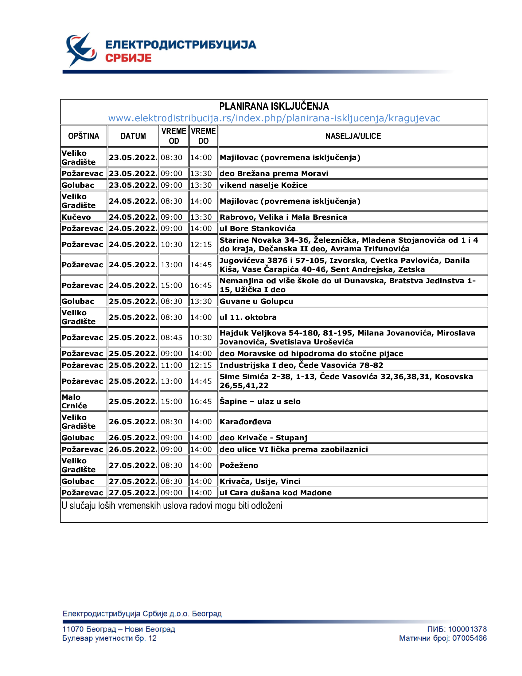 Из Електродистрибуције Србије напомињу да у случају лоших временских услова радови могу бити одложени, о чему ће потрошачи бити благовремено обавештени.
