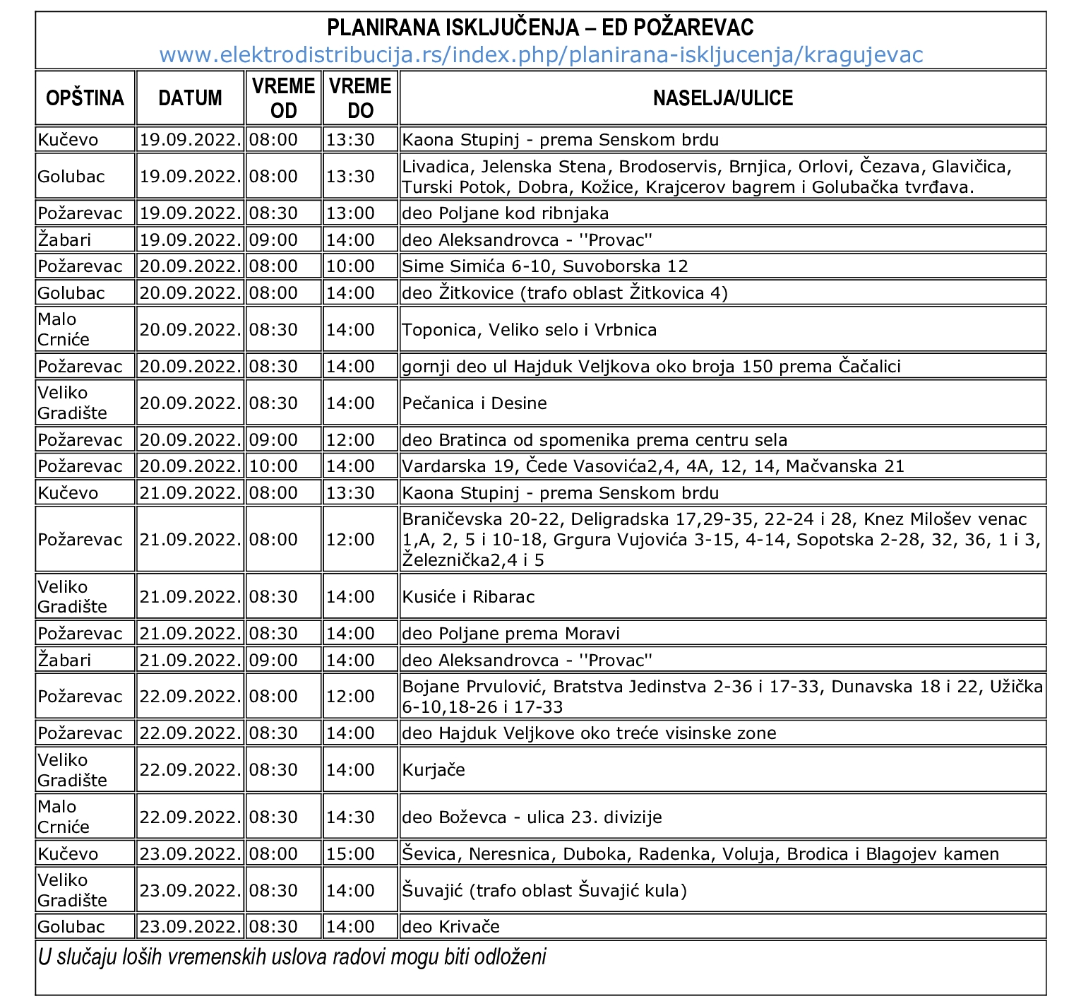 Из Електродистибуције и за следећу недељу, од 19. до 23. септембра, најављују искључења струје широм Браничевског округа.