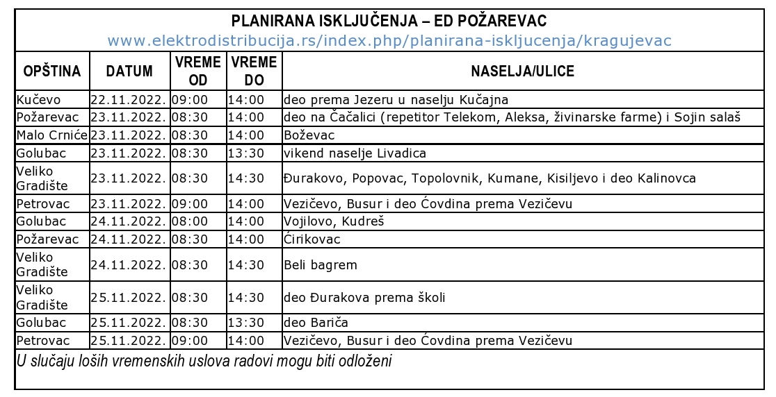 Из Електродистрибуције Пожаревац обавештавајујавност да ће у периоду од 22. до 25. новембра, у времену од 9 до 14,30 часова, на простору Браничевског управног, без електричне енергије остати потрошачи у Кучеву, Пожаревцу, Малом Црнићу, Голупцу, Великом Градишту и Петровцу на Млави.