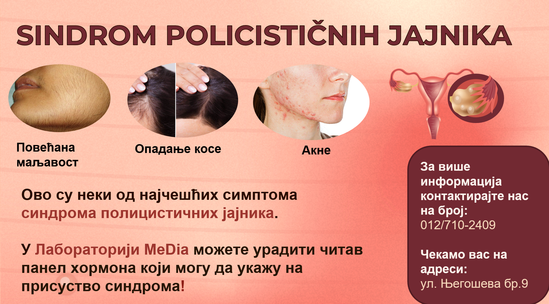 За више информација о анализама које укљујучу панел хормона који се одређује ради утврђивања присуства синдрома полицистичних јајника можете контактирати на број 012 710 2409 или нас посетити на адреси Ул. Његошева бр. 9 где ће вас, у периоду 07-20 сати, дочекати љубазно и стручно особље.