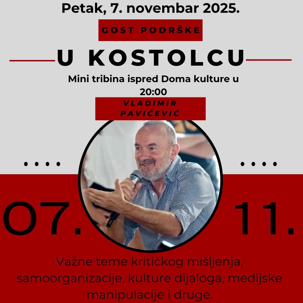 Окупљање је испред костолачког Дома културе, у 20 сати, када ће почети мини трибина. Највљене теме су критичко мишљење, самоорганизација, културни дијалог, медијске манипулације и друго.