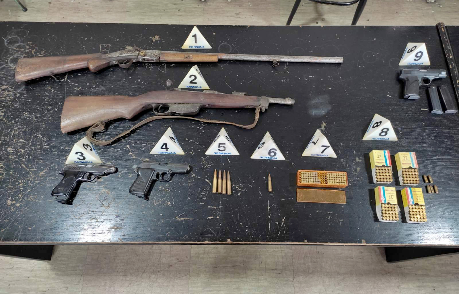 Полиција је у претресу домаћинства осумњиченог, у помоћној згради, пронашла четири пиштоља, ваздушни пиштољ, ловачку пушку ручне израде, карабин, 188 метака различитог калибра, кесу са 130 грама каписли и празних ловачких патрона, као и две машине за пуњење ловачких патрона.