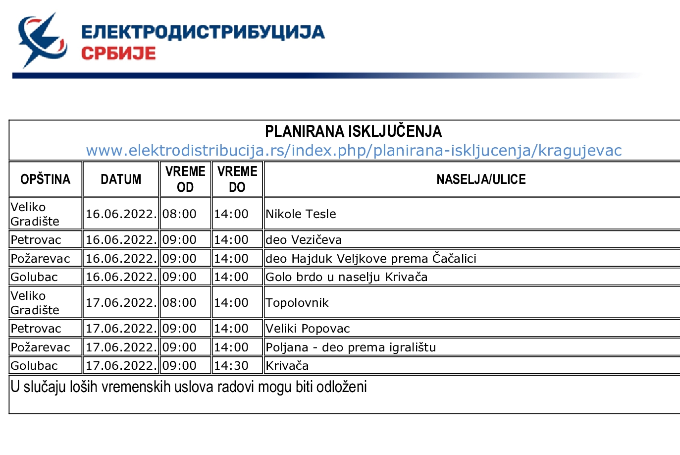 Нестанак струје у четвртак и петак