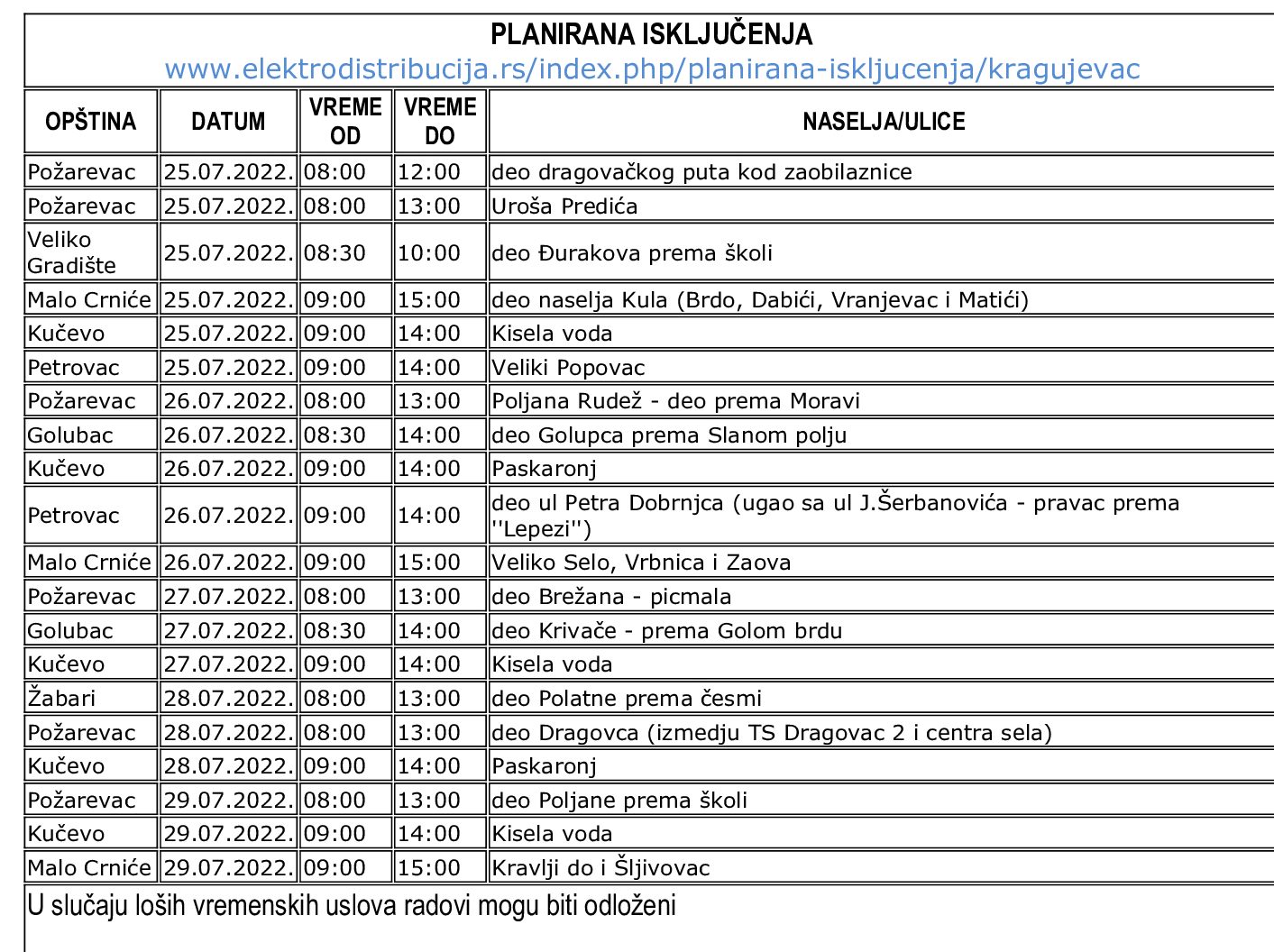 У наредним данима, почевши од данашњег, 25. јула, до 29. јула, без струје ће бити делови Пожаревца, Великог Градишта, Малог Црнића, Кучева, Петровца, Голупца, Жабара.
