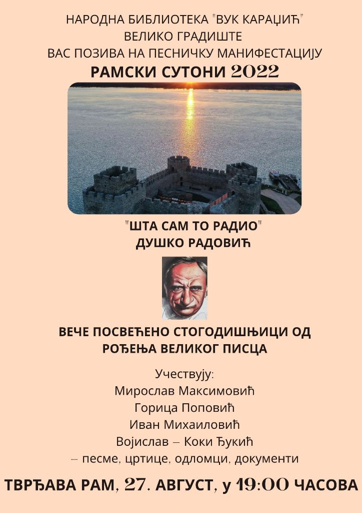И ове године, у окриљу средњовековне тврђаве Рам, Дунава и заносног заласка сунца, биће одржана традиционална песничка манифестација „Рамски сутони 2022“, у суботу, 27. августа.