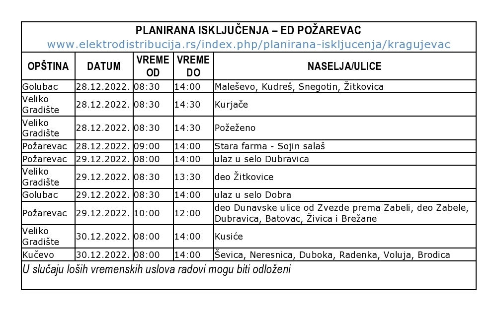 Из Електродистрибуције Пожаревац обавештавају да ће у периоду од 28. до 30. децембра због радова без електричне енергије бити потрошачи у следећим насељима на територији Браничевског округа: