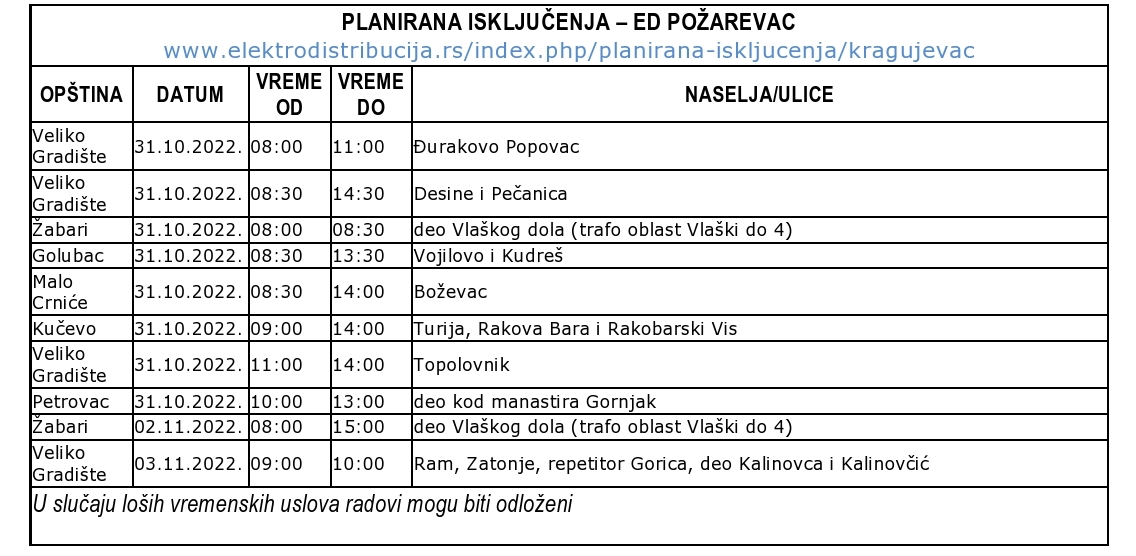 Из Електродистрибуције Пожаревац обавештавају грађане да су за 31. октобар, на територији Браничевског округа, у времену од 8 до 15 часова, планирана искључења електричне енергије у Великом Градишту, Жабарима, Голупцу, Малом Црнићу, Кучеву и Петровцу на Млави.