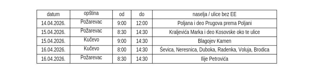 Без електричне енергије ће бити корисници на следећим локацијама: