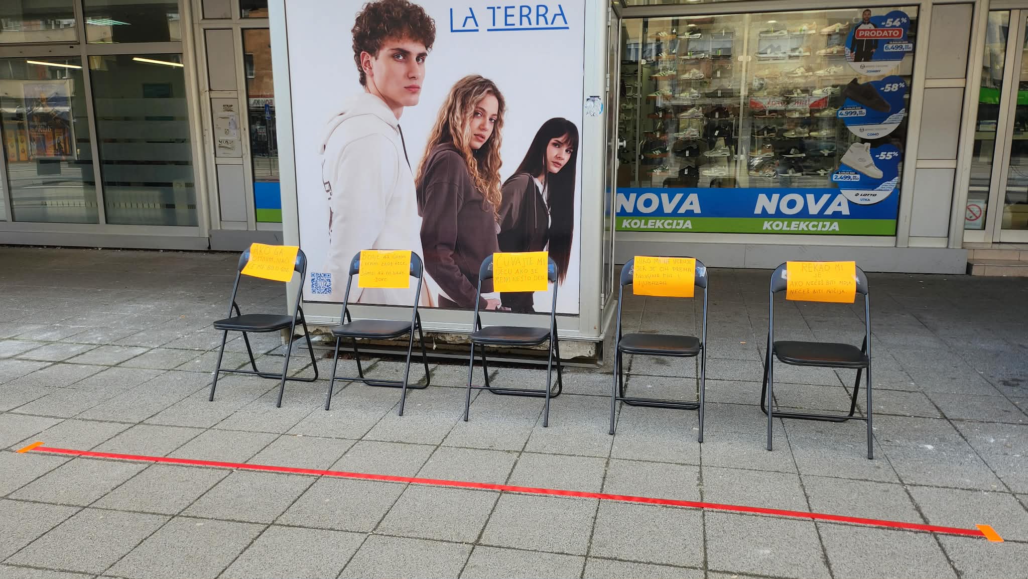 Симболичном „црвеном линијом“ био је ограђен простор у оквиру којег су биле постављене празне столице на којима су се налазиле поруке страдалих жена, жртви насиља, исписане на папиру.