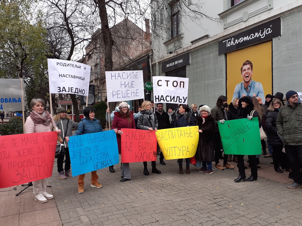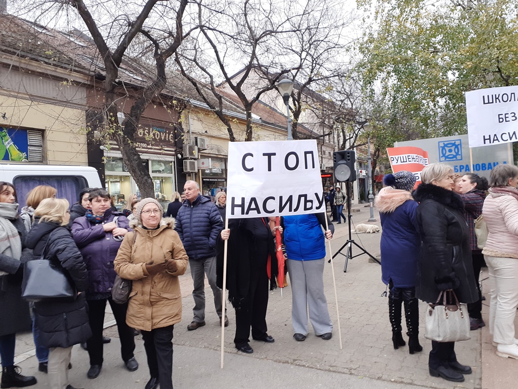 Окупљање у Улици Стари Корзо организовао је Синдиакт оразовања Пожаревац. Председник овог Синдиката Драган Костић, позвао је надлежне државне органе да мењају закон и, пре свега, постарју се да се постојећи примењују да би се насилници адекватно санкционисали: