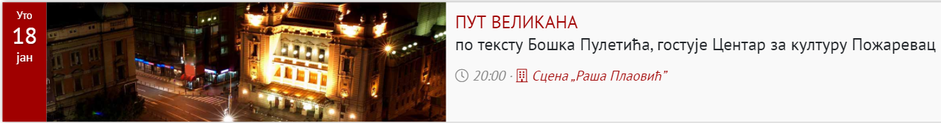 Након премијерног извођења представе „Пут великана“ на Великој сцени Центра за културу Пожаревац, продукцијској екипи и граду Пожаревцу припала је велика част да се комад Бошка Пулетића у адаптацији и режији Весне Станковић изведе у Националном театру у Београду. Наиме, у уторак 18.јануара 2022. године сјајна глумачка екипа представиће се овим делом на сцени „Раша Плаовић“ Народног позоришта Београд.