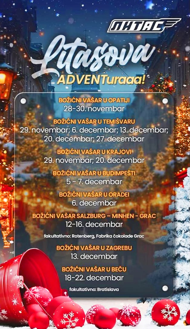 Искористите велики избор Литасових божићних путовања кроз градове Европе и осетите празнички дух Опатије, Темишвара, Крајове, Будимпеште, Орадее, Салцбургa, Минхенa, Грацa, Загребa и Бечa.