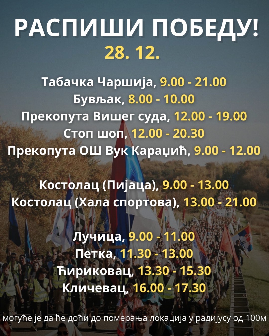 Студенти у блокади позивају на сакупљање потписа с циљем расписивања ванредних парламентарних избора. У недељу 28. деценбра, у Пожаревцу, Костолцу и околним селима поставиће штандове на 11 различитих локација.