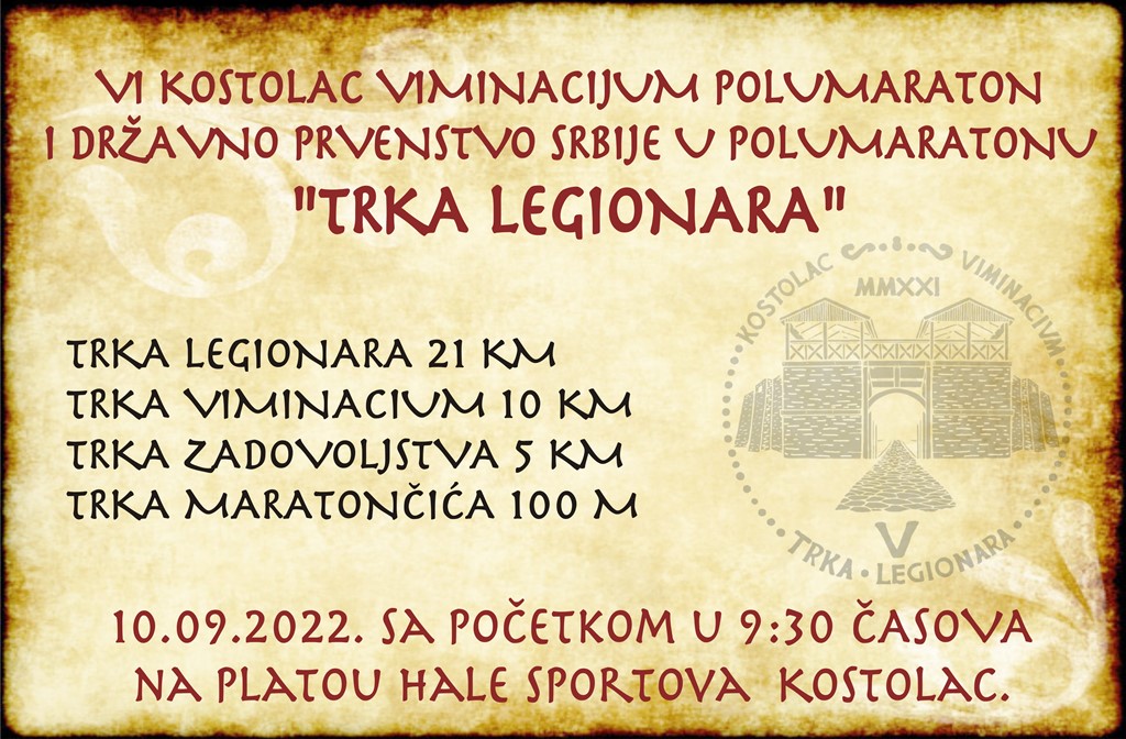 Шести Костолац Виминацијум полумаратон и Државно првенство Србије у полумаратону „Трка легионара“ биће одржани 10. септембра. Почетак је заказан за 9,30 сати, на платоу испред костолачке хале, са крајњим циљем у славном Виминацијуму.