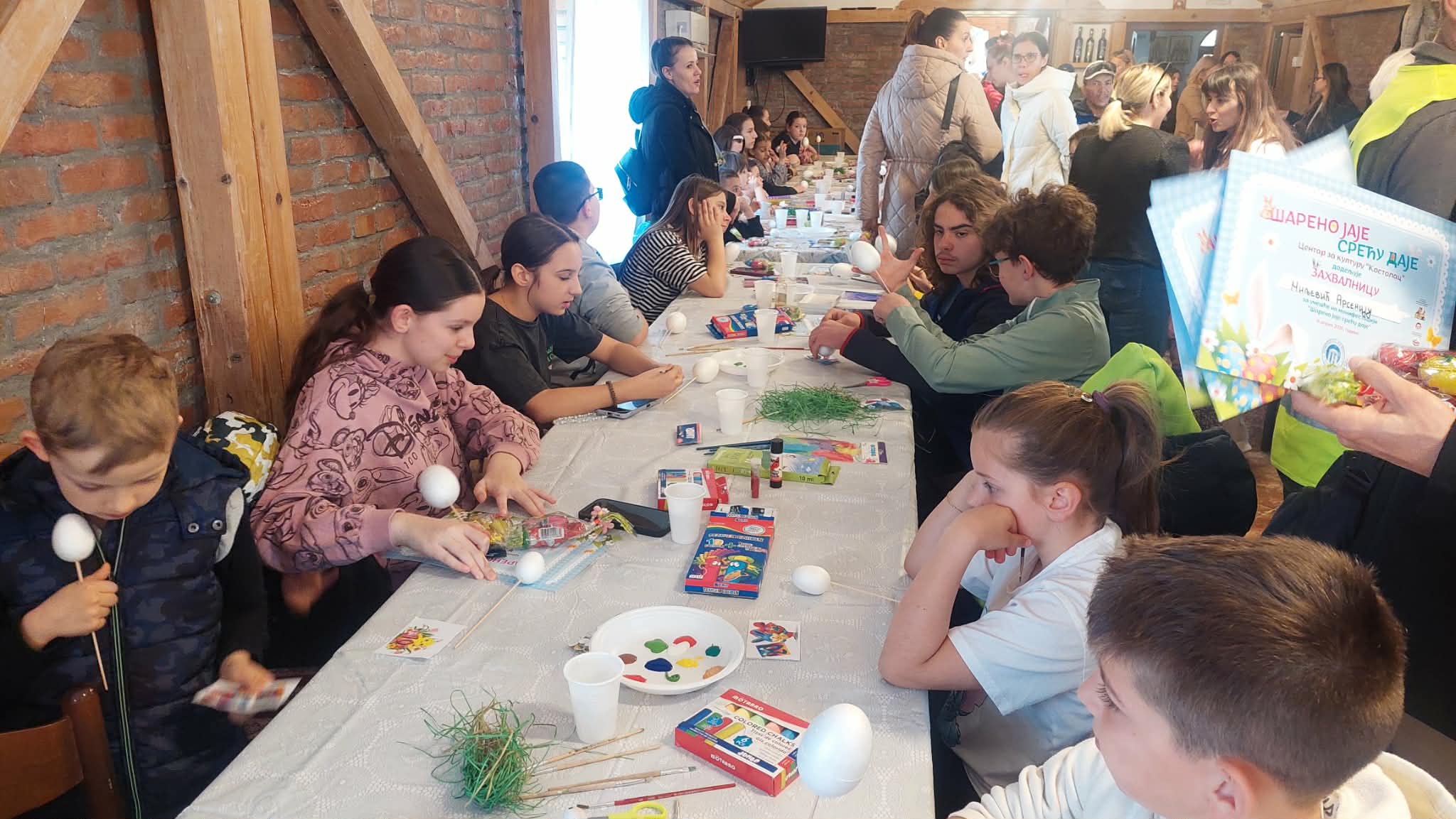 Манифестација је окупила малишане узраста од 4 до 14 година, који су са пуно маште и узбуђења учествовали у надметању. Пуних сат времена украшавали су јаја од стиропора.