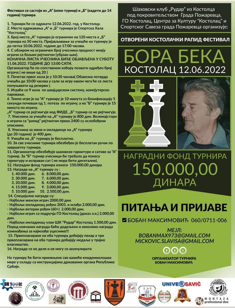 Турнир се одржава у недељу 12. јуна у Костолцу.