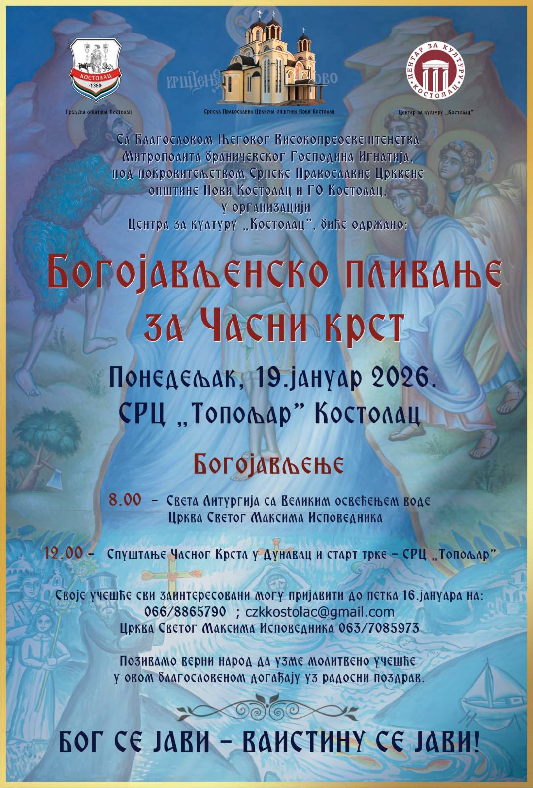 Богојављенско пливање за Часни крст, догађај који окупља верни народ у духу вере, заједништва и традиције, по традицији, биће одржано 19. јануара, у Костолцу, на плажи ,,Топољар“. Учесници се могу пријатити до 17. јануара. У понедељак, 19. јануара, у костолачкој цркви Светог Максима Исповедника, у 8 сати, почеће Света литургија са Великим освећењем воде.