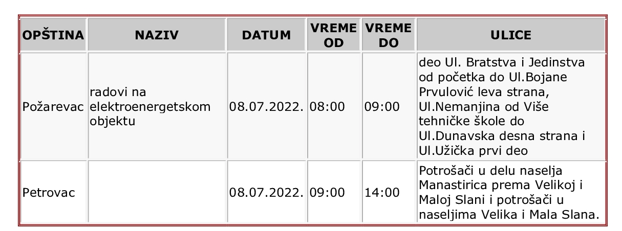 Из Електродистрибуције у Пожаревцу обавештавају грађане да ће због радова на електромрежи, у петак, 8. јула, у времену од 8,00 до 14 часова, без струје остати потрошачи у једном броју улица у граду Пожаревцу и Општини Петровац на Млави.