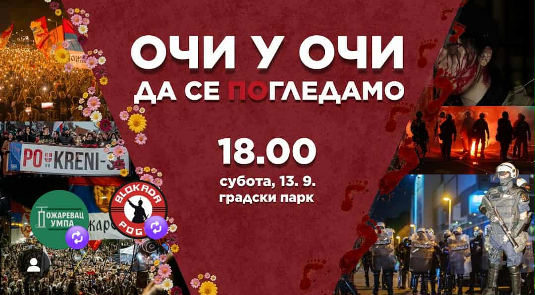 У Пожаревцу је за суботу, 13. септембар, заказан протест „Очи у очи, да се ПОгледамо“, у Градском парку, од 18 сати.
