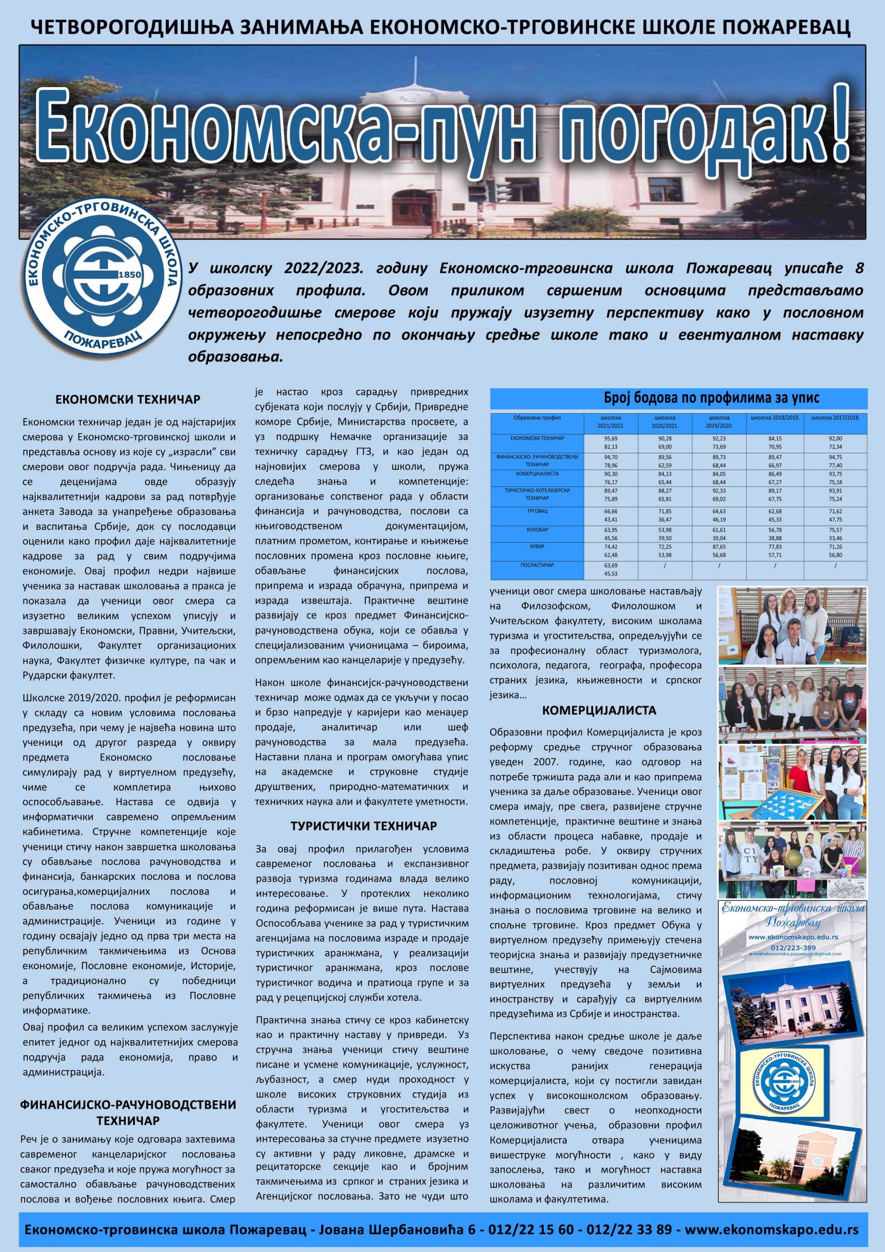Четворогодишња занимања у Економско-трговинској школи Пожаревац